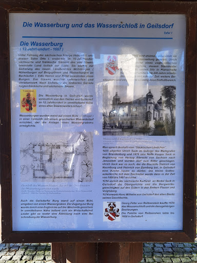 Der Vorgängerbau war eine Wasserburg. Im 12. Jahrhundert erbaut beim alten Slawenweiler für die Herren von Geilsdorf. 1382 wurde Ulrich Sack der neue Besitzer. Er pilgerte mit den hohen Herren Markgrafen von Brandenburg und dem Herzog Albrecht von Sachsen nach Jerusalem. Dort wurde er zum Ritter geschlagen. Die Burg blieb dann 200 Jahre im Familienbesitz der von Sack. 1578 wurde die an von Reizenstein verkauft. Und 1668 kaufte sie Graf von Tattenbach. Dieser vollzog dann den Umbau zum Schloss. Danach waren die von Nauendorf die Besitzer. Bei diesen wurde das Schloss zwar mal restauriert, später begann jedoch der Verfall. Da zu allem Übel auch noch der Wassergraben verfüllt wurde, begannen die Holzpfähle der Grundmauern zu verfaulen. Damit wurde der Verfall noch beschleunigt. Als erstes stürzte der Westturm ein und später noch das Hauptgebäude. 2003 erfolgt dann eine Notsicherung durch die Gemeinde. Heute finden sich also nur noch einige wenige Reste die aber durch ihren ruinösen Zustand ihren eigenen Charme erhalten. Die Ruine ist zwar leicht am zuwachsen, kann aber betreten und umrundet werden. Parken kann man vor der...
