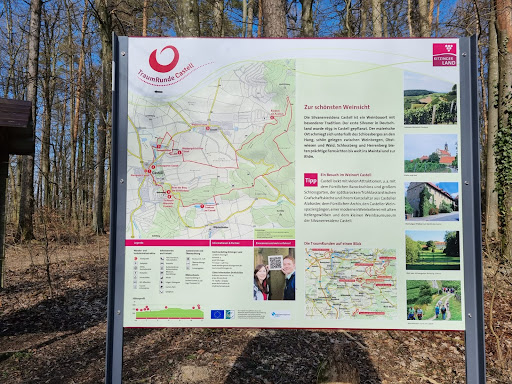 Schöne, abwechslungsreiche Wanderung an Weinbergen entlang, durch Wald und Flur mit toller Aussicht. Die ca. zwölf Kilometer lange Strecke ist sehr gut beschildert. Einen neuralgischen Punkt gibt es allerdings. Nach dem Rastplatz mit Aussicht geht es bergauf bis zu einer großen Kreuzung. Hier treffen die Traumrunde Castell und die Traumrunde Abtswind ( gleiches Zeichen mit gleicher Farbe) aufeinander. Hier sollte man sich rechts halten und Richtung Tränksee/Schlossberg...
