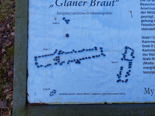 Glane I: die mit Abstand größte Anlage hier. Bautyp Hünenbett (kleine Grabkammer mit übergroßer, rechteckiger Umfassung. Der eingefasste Bereich war ursprünglichmit Erde aufgefüllt und kein Spazierweg wie heute). Die Kammer der Anlage ist schlecht erhalten. Insgesamt ist das Grab aber sehr vollständig. Glane I gehört zu den größten Hünenbetten überhaupt.