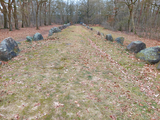 Hier liegt ein besonderes großes Hühnenbett. Einst war es mit Erde aufgefüllt und die Steinreihen waren die Begrenzungen. Heute stehen diese Findlinge offen wie Zähne in zwei Reihen und man kann zwischen ihnen hindurch gehen. Ein Großteil der Anlage war nur Show, aufgehäufte Erde, die eigentliche Grabkammer ist die gefühlt winzige Kammer im hinteren Drittel. Eine vollständige Rekonstruktion einer solchen Anlage findet sich bei den Kleinenknetener Steinen.