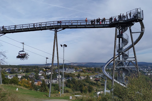 Eine tolle Aussicht gibt es an vielen Orten im Sauerland gratis, aber dass man hier ÜBER der Bobbahn und den Mountainbike-Strecken geht hat schon was! Wir hatten das Glück, dass gerade das Training der Schlitten und Bobs stattfand und sie unter unseren Füssen vorbeirauschten. Die Kletteraktivitäten haben wir ausgelassen, da uns etwas wackelig in den Beinen war. Die Brücke schaukelte, durch die vielen rennenden und hüpfenden Kinder, doch stärker als gedacht. Aber bei bestem Wetter, auf einem Samstag in den Herbstferien war es bestimmt voller als sonst! An der Rutsche hatte sich eine lange Schlage gebildet, so dass wir die Wendeltreppe runtergegangen sind. Auf dieser kamen uns etliche Familien keuchend entgegen, da sie zwar noch einmal rutschen wollten, aber trotzdem das Ticket den ganzen Tag gültig ist, nicht ein zweites Mal über die Brücke gehen wollten. Gerade in Coronazeiten empfinde ich die Treppe für den gleichzeitigen Auf- und Abstieg als zu schmal. Apropos Corona: Ein zweiter Desinfektionsspender am Ende der Brücke wäre super😀 Das war bestimmt nicht das letzte Mal, dass...