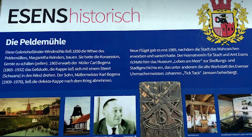 De Peldemühle in Wittmund bestaat sinds 1741, en is een stellingmolen van het type bovenkruier. De gemetselde onderzijde van de molen is om hoger in de wind te komen. Op de bakstenen onderzijde steekt een houten platform, de stelling genoemd. Een bovenkruier heeft een draaiende kap van de molen. Bij andere molentypen draait de gehele molen. In Duitsland (en andere landen) wordt de bovenkruier een Hollandsemolen genoemd. Hollandse molen omdat de uitvinder van de bovenkruier, de Hollandse Ingenieur Jan Adriaanszoon Leeghwater in 1604 was. Ook al had Leonardo Da Vinci in 1500 een soortgelijke ontwerptekening gemaakt, hij had geen oplossing voor het draaimechanisme en de enorme krachten daarop ontwikkeld. De meeste Nederlandse bovenkruier-molens worden via een rad achter op de staartbalk, met touwen of kettingen op de wind gedraaid. Deze molen heeft een kleiner molentje op de kap, waarmee de molen zichzelf op de windrichting houdt.