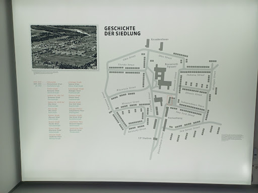 Die Karte des Lagers, die im Erdgeschoß zu sehen ist, legt schon die Zeitschichten des Ortes frei: die 1939 gebaute Siedlung, die für jene Rüstungsarbeiter entstand, die im nahen Geretsried für die Nazis schufteten; das von der US-Army 1945 nach dem Ende der Nazi-Diktatur errichtete DP-Lager für Juden, die auswandern wollten und teilweise bis zur Auflösung des Lagers im Frühjahr 1957 dort lebten; die vom Katholischen Siedlungswerk für Heimatvertriebene, etwa aus dem Sudetenland, geschaffene heutige Wohnstätte. Allein der Wechsel der Straßennamen, der auf der Stadtkarte angezeigt wird – zum Beispiel von „Adolf-Hitler-Platz“ über „Roosevelt Square“ zu „Seminarplatz“ -, macht die widerspruchsvolle Geschichte dieses Ortes deutlich.