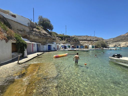 The exact spot marked as "Mandrakia Beach" is misleading. It's not really a beach – more like a rocky patch less than 10 meters long, littered with stones and unfortunately quite a bit of rubbish (plastic, debris, etc.). Despite this, some people were swimming there, but I wouldn't recommend it.
