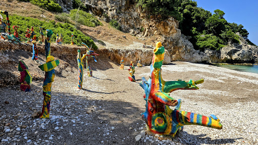Poros liegt ganz im Süden von Kefalonia. Hier kommen die Schiffe vom Festland an ,ansonsten ist der Ort eher verschlafen. Aus diesem Grund ist der Strand auch nicht so überlaufen obwohl das Wasser hier glasklar und sauber ist Geschäfte und Restaurants säumen den vorderen Teil.Hier kann man auch die Schiffe einlaufen sehen. Ansonsten weniger besucht da auch nur wenige Liegestühle. Hier muss man sich um sein Badevergnügen selbst kümmern. Dafür gibt's etwas was ich hier unten noch nie gesehen habe einen Sprungturm (Wer sich traut) Den hinteren Teil erreichen man über eine Eisenbrücke. Er ist schmal und an der Straße entlang, aber auch sehr sauber und bestuhlt. (8 Euro das Set) Hier gibt es auch schöne Unterkunftsmöglichkeiten in den Hang gebaut Es ist ein Kiesstrand mit auch großen Steinen Badeschuhe...