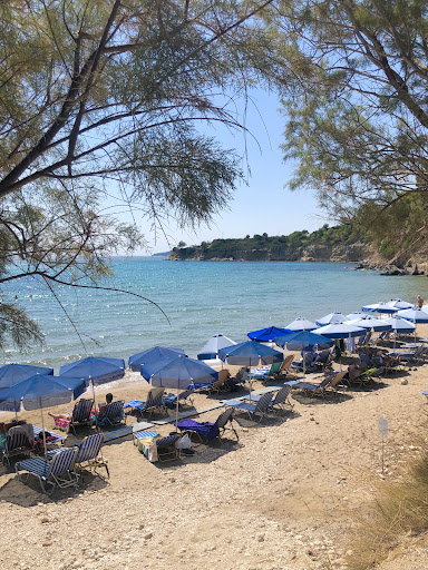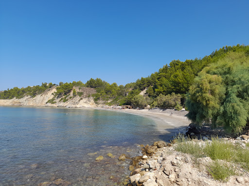 Small beach of 2 halves, main section adjacent to where cars can park on the road with a small sunbed area and beach bar - this area is busier and music is played at the beach bar. We preferred to go past Denis taverna to a very small bay and beyond this, over a few rocks, is yet another long expanse of beach leading towards Kanali beach (naturists at very far end). We visited end July and tended to head down early when the whole area is very quiet and then visit Denis for a Frappe before lunch as the beach starts to get busy from 11ish and bloody hot. Highly recommend Denis for drinks and meals - definitely a cut above the standard taverna. The road down to the beach can get horrifically busy by noon - drive down to the bottom and turn left before Denis taverna to park in shade and then continue up this back road when leaving - although not on Google Street View it is a good road and by far the easiest...