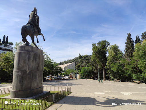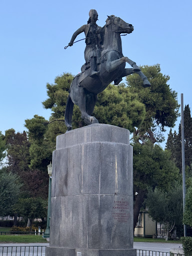 Georgios Karaiskakis(1780 or 1782 –1827)was a famous military commander and a hero, one of the most prominent figures of the Greek Independence War and has played a major role in the liberation of the city of Athens from the Ottoman Army back in 1827. After a long series of victories against the Turkish army, Karaiskakis had started being much less cautious during his battles. In 1827, during a battle, he received a fatal wound in his stomach and was buried later in Salamina. There is quite a bit of controversy concerning the exact way of his death, some sources claiming he was murdered by Mavrokordatos, but the vast majority of the scholars believe he was shot by the Turks. The statue of George Karaiskakis (on Herodou Atticou Street, opposite the Panathenaic Stadium, on the outer boundary of Zappeion), made by the Greek sculptor Michael Tombros(1889 – 1974). A life size bronze statue of General Georgios Karaiskakis is depicted seated on a rearing horse. Karaiskakis is wearing a military uniform with helmet, boots, and a sheathed sword on his left side. He is kolding the reins of the horse in both hands. The statue is set on a 10'...