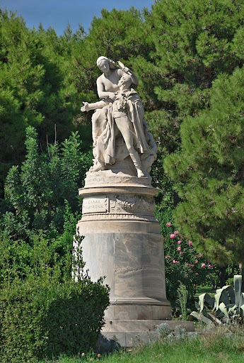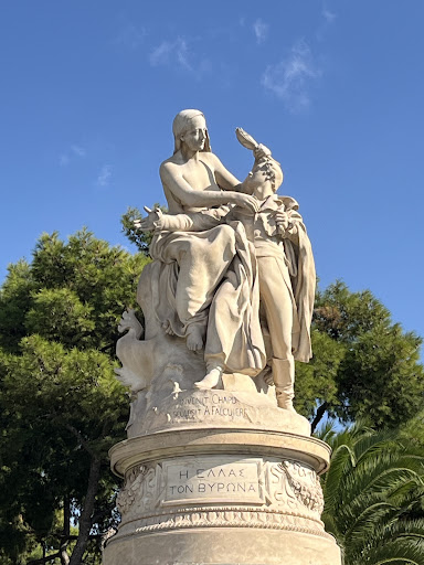 Read moreΤο μαρμάρινο σύμπλεγμα γνωστό ως «Η Ελλάς τον Βύρωνα», διαδοχικά φιλοτεχνημένο από τους Henri Michel Antoine Chapu και Jean Alexandre Joseph Falquière, ανεγέρθηκε με πρωτοβουλία και δαπάνη του ομογενή Δημήτριου Στεφάνοβικ Σκυλίτση, και εγκαινιάστηκε στον κήπο του Ζαππείου στις 19 Φεβρουαρίου 1896. Η μαρμάρινη γλυπτική σύνθεση παριστάνει την Ελλάδα με μορφή ημίγυμνης καθήμενης γυναίκας που περιβάλλει με το μεγαλύτερης κλίμακας σώμα της τον Βύρωνα. Με το δεξί χέρι η μορφή αγκαλιάζει το στήθος του φιλέλληνα, στο ύψος της καρδιάς, και με το αριστερό πάνω από το κεφάλι του τον στεφανώνει με φύλλα δάφνης, ως ένδειξη ευγνωμοσύνης για τις υπηρεσίες του προς αυτήν. Η γυναικεία μορφή αποδίδεται γυμνή έως τη μέση του κορμού. Το υπόλοιπο σώμα καλύπτεται από μανδύα με έντονες πτυχώσεις που αγκαλιάζουν έως πολύ χαμηλά τα σταυρωμένα πόδια της, των οποίων η κατάληξη προβάλλει ανυπόδητη. Το κεφάλι καλύπτεται με κεφαλόδεσμο, με πτυχές ριγμένες στην πλάτη από αριστερά, που καταλήγουν χαμηλά. Από την άλλη, ο νεαρός Βύρων, στηριγμένος έναν αναβαθμό χαμηλότερα από τη γυναικεία μορφή, με το σώμα σε κλίση προς τα αριστερά του και την κεφαλή στραμμένη έτσι που το βλέμμα του να συναντά το πρόσωπο της γυναίκας, απλώνει το δεξί του χέρι πάνω στα πόδια της καθήμενης μορφής, προς τα δεξιά της, με την παλάμη ανοικτή, ως ένδειξη προσφοράς του εαυτού του στην Ελλάδα. Στο δεξί χέρι του κρατάει ειλητάριο. Είναι ντυμένος με ευρωπαϊκό κοστούμι εποχής, καλυμμένο με μακρύ μανδύα, και φορά μπότες κάτω από το γόνατο. Η ενδυματολογική απόδοση, ανάλογη της κοινωνικής θέσης του τιμώμενου, παραπέμπει εμφανώς στην εικονογραφία της περιόδου (Πηγή 1). Τη σύνθεση συμπληρώνει ημιανακεκλιμένη γυμνή ανδρική μορφή, στην πίσω αριστερή πλευρά των βασικών μορφών του συμπλέγματος, η οποία συμβολίζει τον υπό ξένη...