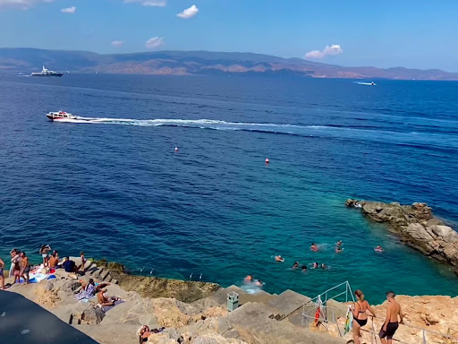 Spilia beach and sunset restaurant is in my view truly unique. Coming from South Africa where we have access to some of the most beautiful soft white sandy beaches, getting into the deep blue waters of the Aegean sea by climbing over rocks and then down with a stainless steel ladder, was a bit scary but absolutely exciting!We loved the whole experience of just floating on the calm warm water which now and then become a bit wavy as passing sea crafts stirred up the water. Kids were jumping from the rocks, shouting and challenging each other. Lovely young bodies in tiny swim suits mixed with older bodies showing off lives well lived and everybody was enjoying themselves. Then when you are properly cooled off make your way upstairs to the bar area, find a chair with a view, order a spritz and just enjoy the bliss of being on...