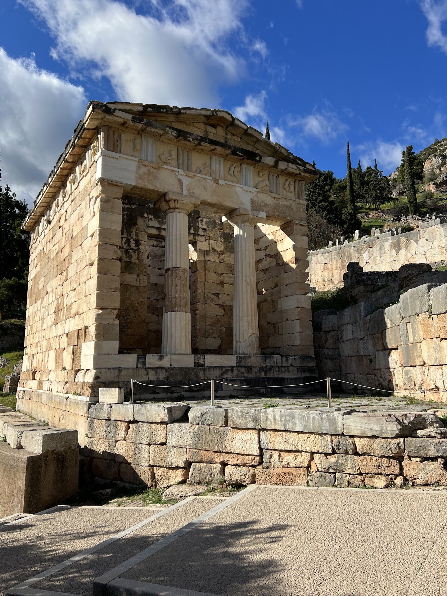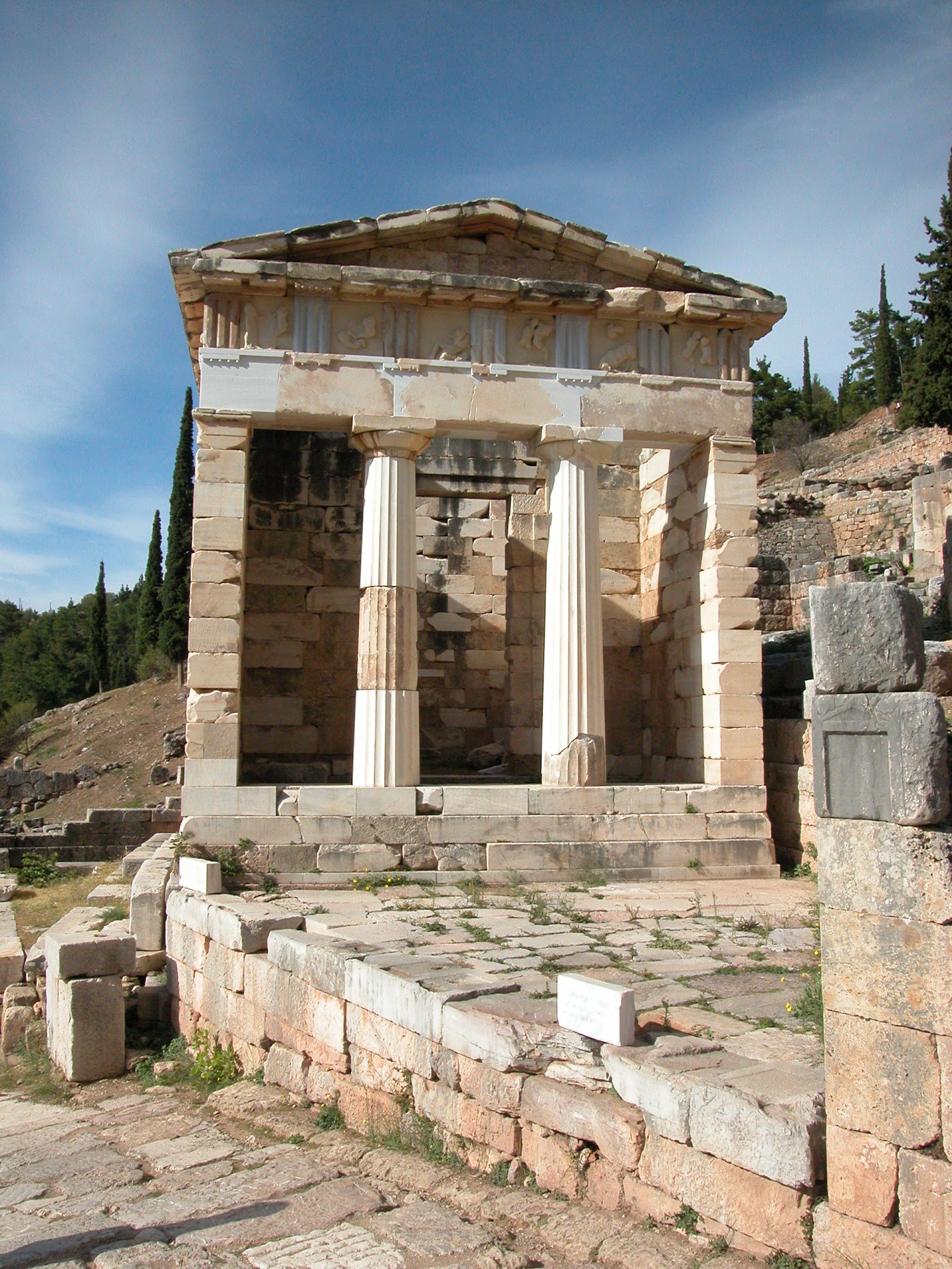 The Athenian Treasury at Delphi was constructed by the Athenians to house dedications and votive offerings made by their city and citizens to the sanctuary of Apollo. The entire treasury including its sculptural decoration is built of Parian marble.