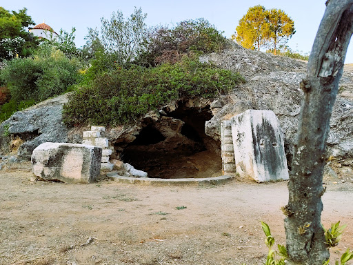 Στην είσοδο της «σπηλιάς» βρίσκονται δύο ογκώδη βάθρα αγαλμάτων με επιγραφές προς τιμήν των Ρωμαίων αυτοκρατόρων Ανδριανού και Σεπτίμιου Σεβήρου, αφιερωμένες από το δήμο Ιστιαίας. Το πρώτο φέρει και μεταγενέστερη επιγραφή προς τιμήν του αυτοκράτορα Κωνσταντίνου του Βυζαντίου.