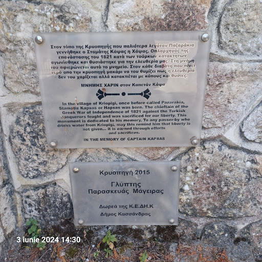 Read moreUn loc cu o însemnătate istorica puternica pentru micul orășel Kriopigi. Este un tribut adus unui erou al razboiului antiotoman. Se ajunge relativ ușor doar trebuie sa traversati strada principala și sa urcați spre pădurea de pini. Odată ajunși nu veți regreta niciun moment alegerea făcută. Va puteți adăposti de canicula și sa va bucurați de o gura de apa rece și gustoasa. Tot aici găsiți și un frumos amfiteatru unde puteți face câteva fotografii...