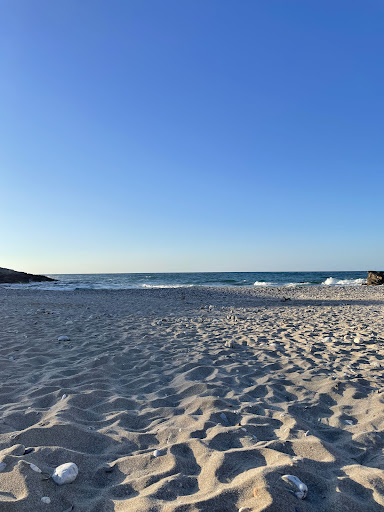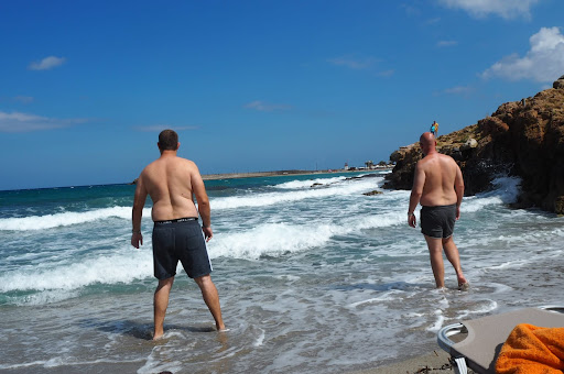 Lovely, quiet little beach. Sunloungers are €7 for 2 and the guy who runs it gives you watermelon and a bottle of water for free. It's a rocky seabed so he also throws in free use of beach shoes to make your swim more comfortable. He sells beer, soft drinks and another guy comes around selling doughnuts (delicious!). This was our favourite...