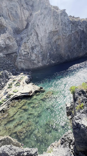 The parking lot up top is quite small, and it can be a bit challenging to park with a smaller car since it is not paved. However, parking is also possible along the road, and the lower parking lot is only for those staying there. It's not difficult to walk down; immediately to the right of the entrance, there is a shorter path leading down. The water is quite deep, so there is an opportunity for diving. A sunbed costs 10 euros for the day, but it's comfortable. The view from the top is beautiful, and it's easy to climb the stairs. Unfortunately, the bridge is no longer there, but there is a pool next to the bar, and you can walk behind the boat to the upper right side. It became one of my...