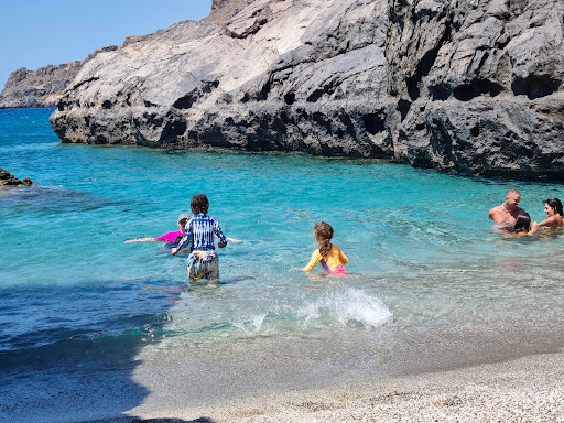 Read moreYou need to find your own way down the rocks, but we did it with a 7 year old in a good pair of shoes. The beach is made up of small, smooth pebbles, which are very comfortable under foot and make the water a crisp crystal blue. Get there early to set up next to the rocks for some shade. It was too windy for an umbrella on both occasions we visited. Use the showers at the neighbouring Mikro Ammoudi beach, which also has a...