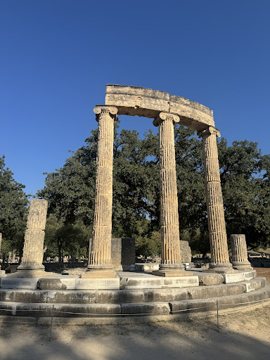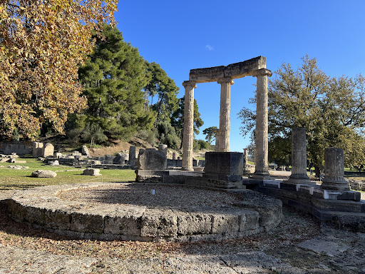 Read moreΤο Φιλιππείο ήταν ναός εντός του ιερού χώρου της Άλτεως, δυτικά του ναού της Ήρας και ήταν το μοναδικό κυκλικό οικοδόμημα στην αρχαία Ολυμπία. Το Φιλιππείο, σύμφωνα με τον Παυσανία, ήταν κυκλικός περίστυλος ναός με κίονες πάνω σε κυκλική μαρμάρινη κρηπίδα με τρία σκαλοπάτια. Υπήρχαν δεκαοκτώ ιωνικοί κίονες με βάσεις απλού αττικού ιωνικού ρυθμού που πάνω τους στηρίζετο πώρινος ιωνικός θριγκός, ενώ στο εσωτερικό του σηκού, περιμετρικά, υπήρχαν εννέα κορινθιακοί ημικίονες και ημικυκλικό βάθρο, όπου τοποθετήθηκαν 5 χρυσελεφάντινα αγάλματα της μακεδονικής βασιλικής οικογένειαας. Η κορυφή της στέγης κατέληγε σε κεφάλι παπαρούνας που συγκρατούσε όλες τις δοκούς και ήταν καλυμμένη με μαρμάρινα κεραμίδια. Ο αρχιτράβος και η ζωφόρος είναι από ένα ενιαίο μάρμαρο. Ο σιμός μαρμάρινος, διακοσμημένος με λεοντοκεφαλές και πλατανόμορφα κεραμίδια. Η κατασκευή του ναού ξεκίνησε από τον Φίλιππο Β' μετά τη νίκη του στη μάχη της Χαιρώνειας το 338 π.Χ. και ήταν αφιερωμένος στον Δία. Η κατασκευή ολοκληρώθηκε από τον γιο του, Μέγα Αλέξανδρο, ο οποίος πρόσθεσε στο εσωτερικό του ναού χρυσελεφάντινα αγάλματα, φιλοτεχνηθέντα από τον γλύπτη Λεωχάρη, που απεικόνιζαν μέλη της οικογένειάς του. Το μνημείο, εκτός από αναθηματικό χαρακτήρα είχε και λατρευτικό, αφού χρησιμοποιήθηκε για τη λατρεία της βασιλικής οικογένειας...