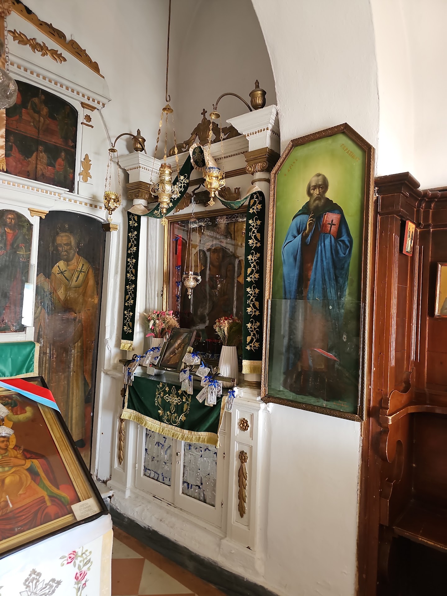 The interior of the monastery, of the church, it is very small, with walls painted in white, with a lot of framed paintings on the walls. There is a place were you can put a diptych and to take candles. The place where you can light the candles is located outside the church.