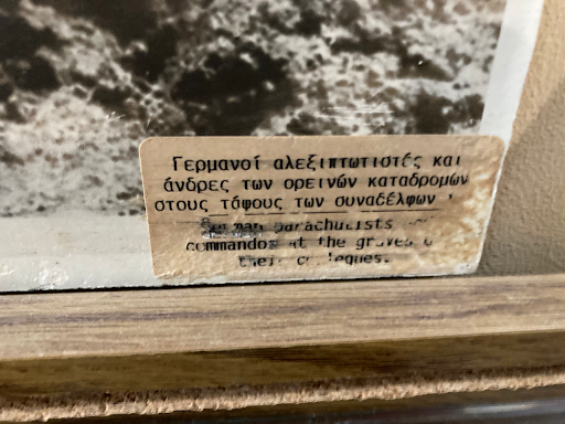 In the small WWII area, i.e., “Battle of Crete” section, some items have Greek & English captions, and the English is most welcome. However many artifacts and photos in which I was interested lacked captions or the captions are worn and illegible.