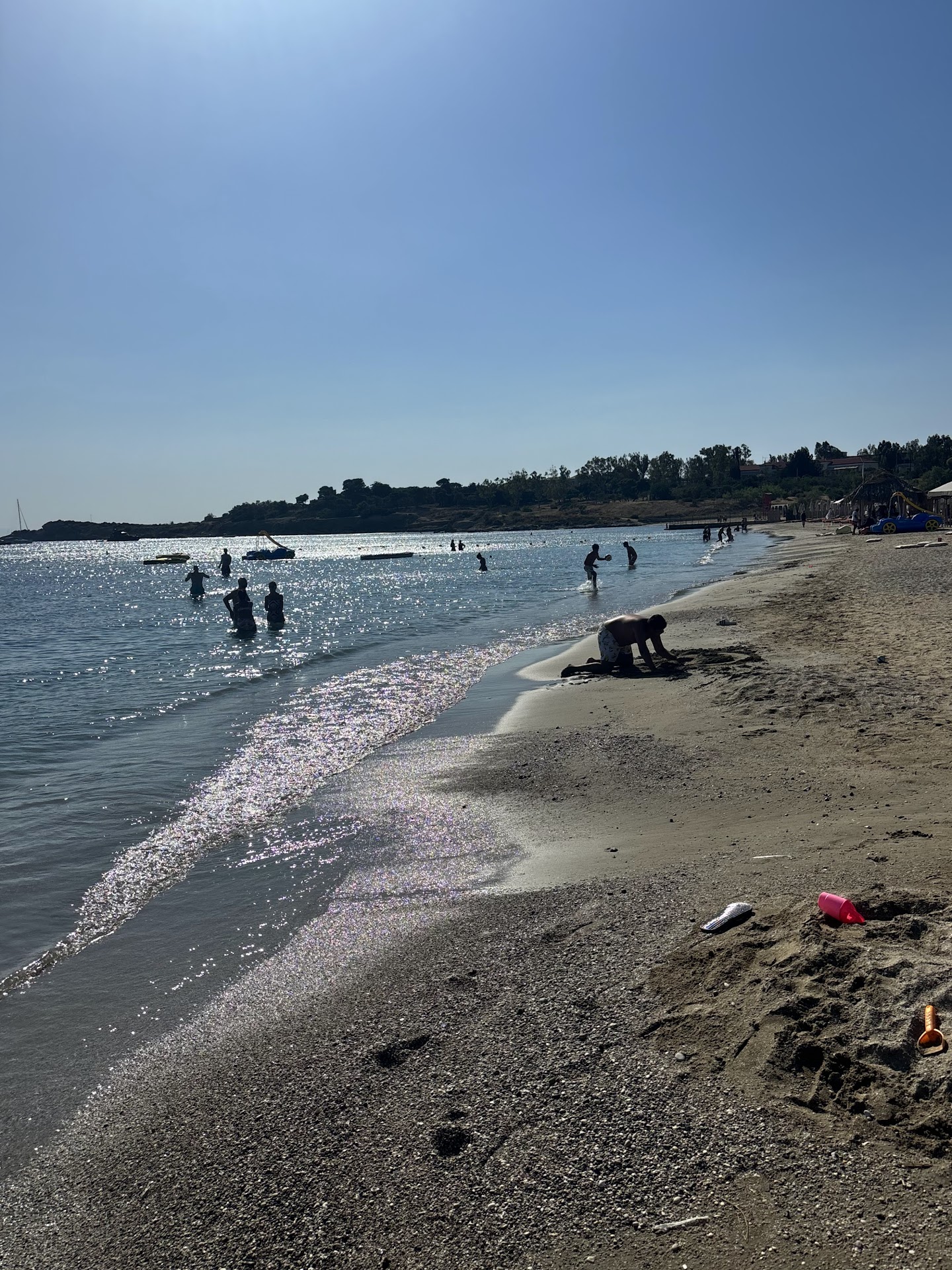 Beach has great gradual decline into water and great for kids as it's shallow enough to kids to stand up for the first 20 meters into the water. The water had floaty bits of small plants and stuff which was the case with all the beaches. Wasn't any painful rocks in the water either which was nice as we went to Akti Iliou beach yesterday and there were so many painful rocks as we went in for the first 4 meters.