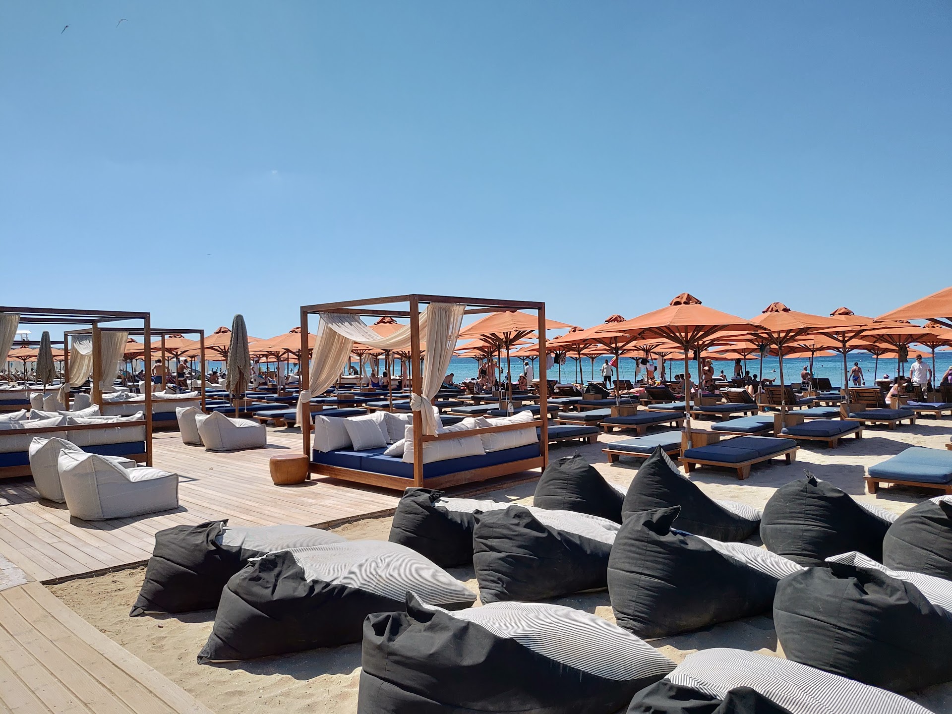 The best toilets and changing rooms I've seen at any beach! Nice atmosphere and decor of restaurants. Fairly priced food. Qr code ordering and waiter service to lounge chairs. High quality beach shops once you enter. Nicer than guys walking around selling stuff in my opinion. Felt safe. Very family friendly.