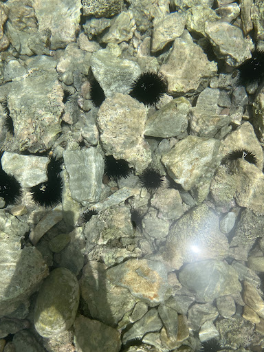 If you consider 2-inch pebbles sand, then this is a sandy beach. Wear shoes: if the rocks don’t get you, the sea urchins will (see photo). The hotel owns most of the beach and you have to pay exorbitant amounts to dip your toes. There is another, rockier beach to the East, but it seems to be owned by a restaurant, although the fee to use the beach is more reasonable. There is a tiny strip of waterfront that appears to be public although it is probably somebody’s front yard. At least, no one came to scan our credit card. Last warning: the boat to take you back to Hydra only comes once an hour and even then only if there are passengers headed to the resort, so you may...
