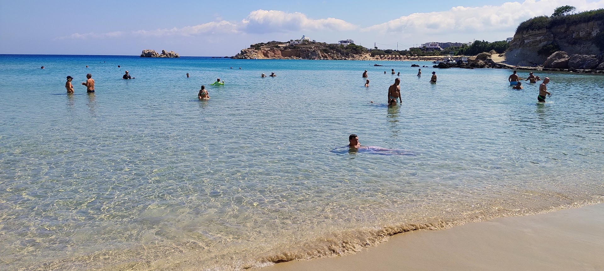 The beach is very small.It is situated in a sheltered bay and even on very windy days the water is calm and perfect for swimming.Fine nice sand and shallow seabed for 40-50 meters.Ideal for kids.The bad thing is that there are only about 30 umbrellas and when we arrived at 9 in the morning all of them had towels on the chairs put there maybe from the previous evening.The first time I see such a silly thing on a...