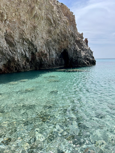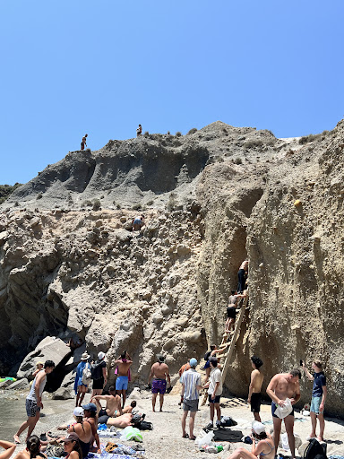 Read moreThis spot must have started as a meme, and now has gotten out of control. Let me emphasize- there is nothing special about this beach, beyond a somewhat challenging descent (via 2 ladders and a narrow pathway). The beach itself is tiny- you may NOT have place to lay down, and is not sandy. Because a lot of unprepared tourists flock there for Insta or whatever, it may take you 30-45 minutes, or longer, to make a very short descent. People come with bags and completely unprepared to climb. As a result, they take FOREVER to climb up or down. You will stand in a long line in scorching sun, looking at all sort of craziness. The narrow passage can only accommodate 1 person, so there’s constant struggle between those descending and those climbing out. Tempers flair and some visitors lose it and start shouting, feeling trapped and frustrated. PLEASE PLEASE PLEASE be prepared before going there - both hands empty and proper shoes for climbing. Other dress elements seem to be optional 🫢 (love Greece). The bottom ladder is missing a step, can be a challenge for some. Every time someone climbs up or down, clouds of sand sift down and fly through the air onto beach goers below. When we were there, one person lost their cool and started climbing the sheer rock wall to climb out. Do not do this! A number of large rocks fell down and almost hit people below. In other words, the place is a hot mess (literally). But if you’re into a challenge and a younger crowd, this may be something different to try. There are grottoes to the left, and more secluded caves where some visitors manage to suntan. Also a cave to the immediate left filters out sunlight and help make great photos. Enjoy...