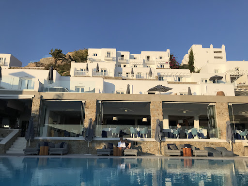Read moreOur family (me, my husband, and our two kids aged 21 and 19) spent 3 nights at the Myconian Ambassador on our recent vacation. It is a beautiful property with top-notch service. We entered the spacious white lobby and were greeted by several staff dressed in impeccable white suits, and then invited to sit on the low couches and have a welcome drink while our rooms were prepared. We asked for two rooms close together and they gave us rooms next to each, which was very convenient. It was a little challenging navigating to them (go down a long hall, go up two floors in the elevator, then go around a corner, down a hall, around a turn, another hall and get to the second elevator, then exit, turn to the left, down two steps, a right down an outdoor passageway, and then a left to our rooms), but once we figured that out, we were good! The kidsâ room had a tall square shower and a room divider that could be closed to separate the bathroom area from the sleeping area. Our room was an open concept featuring a tall cylinder shower that was dramatic, but we learned it leaked on the back side. Both rooms has lovely balconies overlooking the sea. ||Our room came with a free lunch and we took advantage of that the first day. We had two courses, which honestly ended up being way too much food, but it was all so delicious. We had gyros, seafood pasta, grilled seabass, and lamb chops and some lovely cocktails. And everything was amazing. The service was outstanding. Each time I came to the pool, a waiter quickly brought me a menu, and served me water and beautiful drinks quickly. Once, they brought around ice cream bars for all the guests at the pool. And at the end of the day I was amused to watch them re-aligning each of the sun chairs to line up exactly with the others. ||The breakfast at the Ambassador was outstanding. It has a wonderful buffet of cereals, breads, pastries, fruits, salmon, meats, cheeses, Greek yogurt, jams, spoon sweets, and also a large selection of hot dishes including various sausages, tomatoes with feta, potatoes, baked beans. But in addition to all that, you could order eggs including boiled, fried, scrambled, benedicts and crepes. It was the best breakfast of all the hotels we stayed at on our two weeksâ vacation. We very much enjoyed...