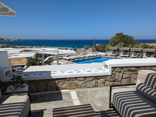 Read moreThis Luxury hotel is nestled in the hills of Mykonos. It has spectacular views of the ocean and hillside. The hotel is absolutely BEAUTIFUL! It, like all Mykonoian structures, was white washed with accents of the beautiful Bougainvillea trees.||In the evening the spot lighting on the exterior of the hotel magnifies its beauty. You could also take in the mesmerizing sun setting over the mountain ridge. This was such an amazing view of the skyline as the sky filled with colors of yellows, oranges, and reds. The rooms had a minimalistic feel but with comfort. ||Xanthi and the hotel staff, what can I say, 5-star customer service hands down!! I had an issue with delayed luggage. Once it arrived the contents were damaged. They worked effortlessly with the airport to get my bag to the hotel. They also assisted me with whatever I needed so that this didn’t ruin my stay/trip!! This made a world of difference. They definitely care about their guest and their guest experience! To add to the guest experience, you would see Andres around the resort checking in with guest and their stay. The cleaning staff was courteous and kept everything tidy. They were very accommodating if I needed extra towels, shampoo, etc. The wait staff were friendly and attentive. You were always greeted with a smile. The hotel restaurant was good and the food was tasty. Breakfast was continental style, but you could also order omelets and additional items. The pool was small but access to pool chairs was never an issue. It was just the prefect size. The hotel offered a shuttle into town through out the day and evening. They also offered car service to/from your room, if needed. For me, this was the perfect hotel to veg and disconnect from the rest of the world. I would definitely stay here again!||I know you’re thinking there has to be some CONS! ||Yes, #1, I HAD...