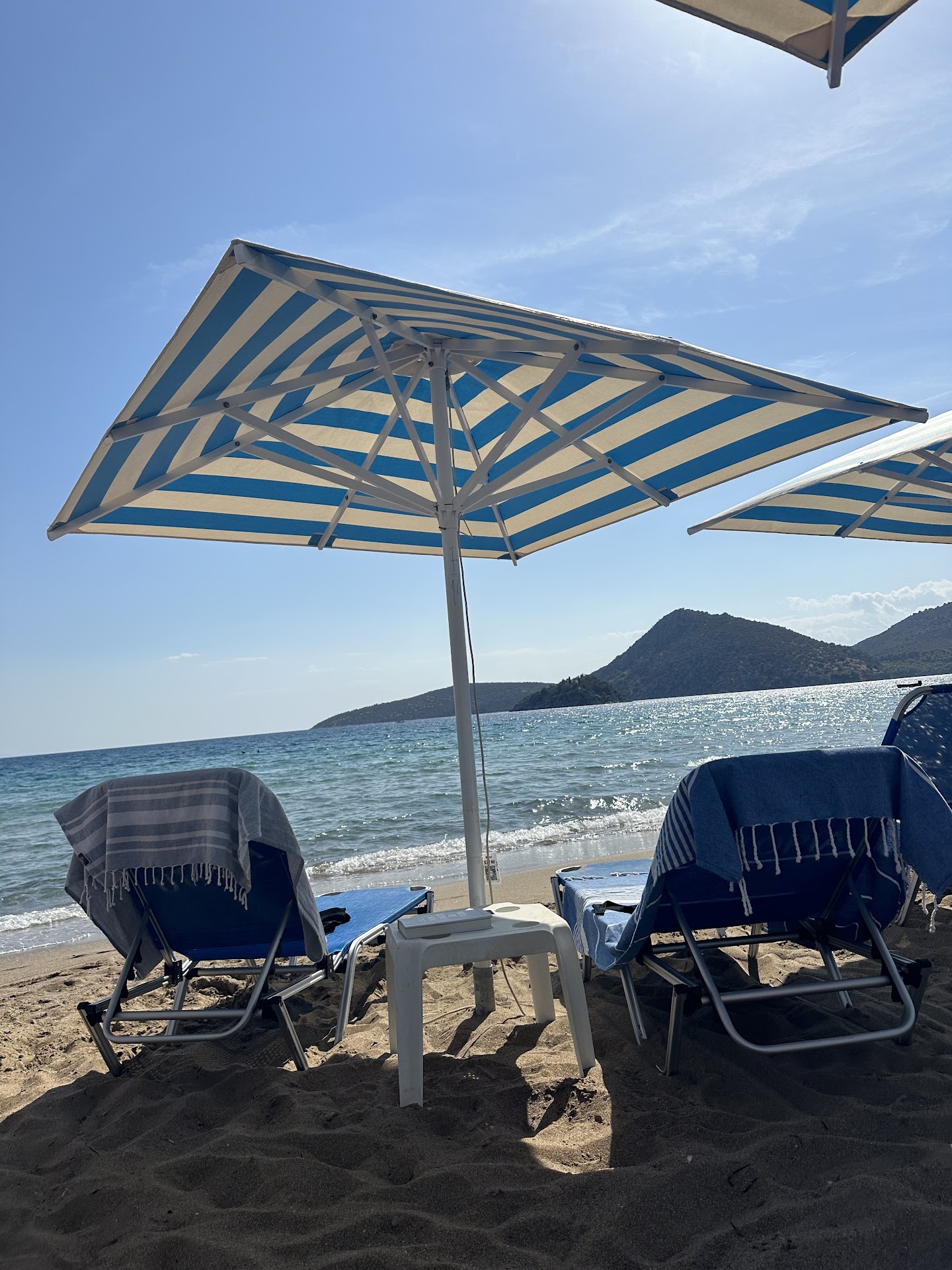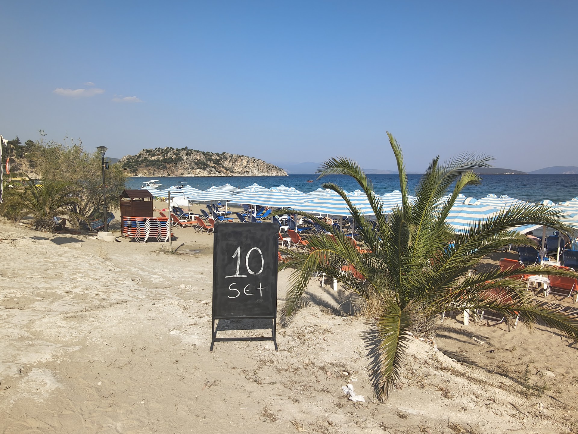 Having read about the bad service at Ammos, we opted to rent beach chairs with the other provider and were happy with the service and price: 10 Euros for 2 chairs for the adults and the two kids (7 and 10) got a chair each (free of charge). Perhaps we got the discount as we went in the middle of October and it looked like things were shutting down for the season.