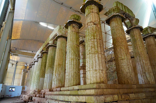 This was an off the beaten path Temple in the mountains of Peloponnese Greece. It was surprisingly cold at this elevation in mid March but enjoyable. There is a couple that is at the base of the site that sells the government tickets to get in. They are very nice with a "security" cat that follows you looking for love from the tourists...very friendly! The site is all under an enormous tarp tent that is cabled to the ground in concrete as it is in an active state of restoration that is a site to behold. They are lifting and replacing section of HUGE collumns and flooring. The engineer work is really a joy to behold as most people have never seen this sort of engineer work done before. We thought this was one of the most interesting and educational sites that we went to in Greece. Very well maintained! Not to be missed.