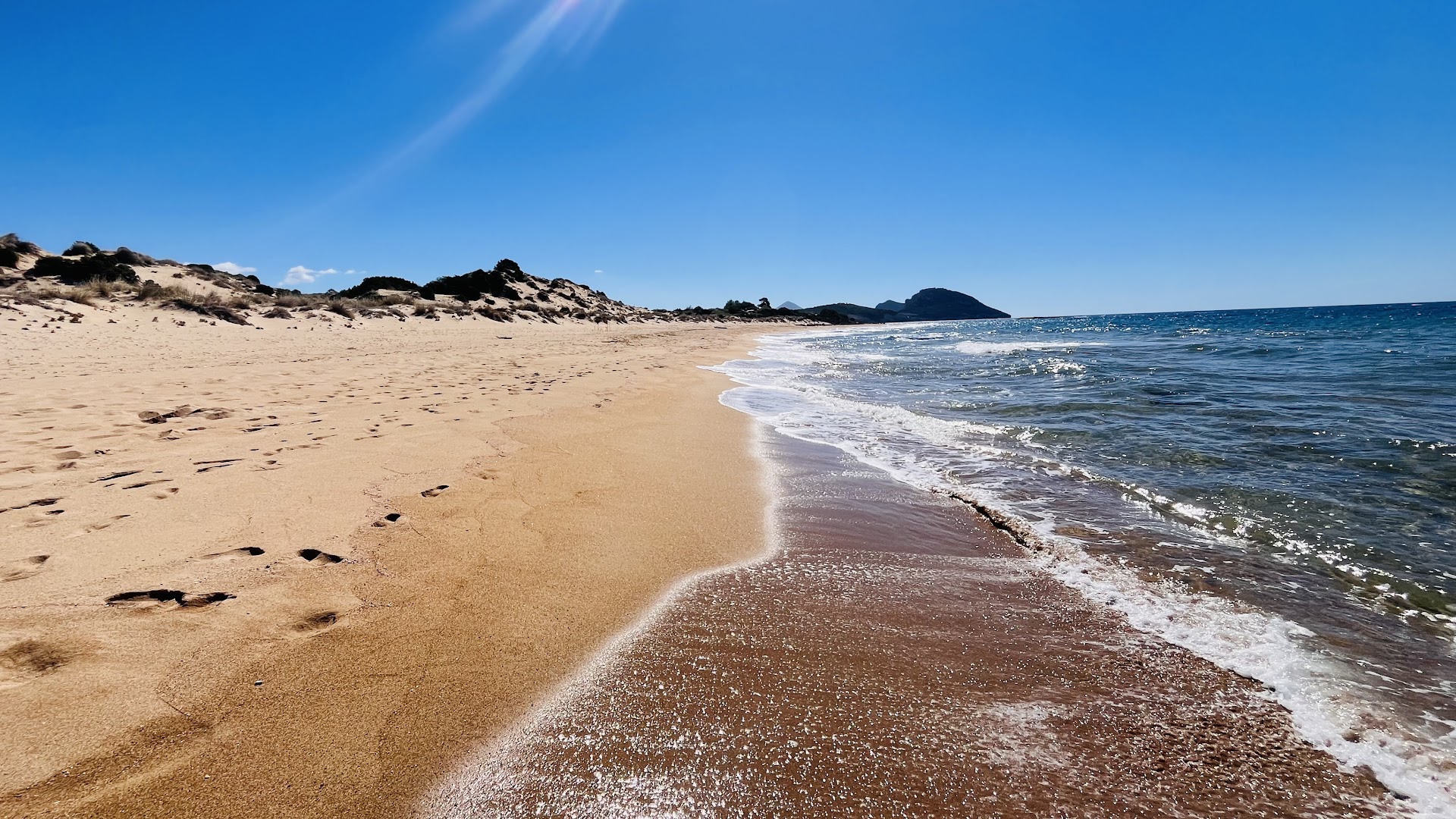 Early October and I have the entire southern side of this beautiful beach to myself! The water is an ideal 23 degrees C, clean and clear. The beach is backed by a small dunefield so you really feel immersed in nature. Beach bliss. Arrive down a narrow twisty tarred road to a generous parking lot, which is overnight van friendly. My first stop on the Ionian coast- hoping that what lies north of here on the western Peloponnese coast...