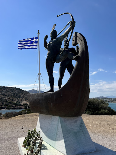 Ahora sí, ingresando donde se encuentra dicho monumento te encontrarás con 2 soldados griegos en lo que parece representar la popa de un trirreme. Al estilo griego antiguo están desnudos con un cuerpo esbelto, uno sostiene un arco y el otro una lanza y un pequeño escudo. A su lado la bandera griega flameando orgullosamente. Si bien se menciona la palabra "túmulo" en alguno de los carteles que allí señalan este monumento, no estoy completamente seguro de que sea el lugar donde se hayan enterrado a los caídos en esta batalla. Pero desde este punto podemos ver el campo de batalla bastante bien pues fue exactamente delante del monumento donde transcurrió: en el estrecho de Salamina.