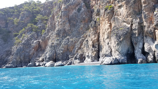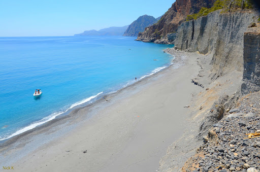Read moreDo plaży dopłynęliśmy motorówką z portu Chora Sfakion. Po zacumowaniu motorówki dopłyneliśmy do wyspy wpław. Potężne i okazałe ściany Domaty zdają się bronić dostępu. Osadzone w ścianach duże kamienie sprawiają wrażenie jakby miały zaraz spaść na głowę. Plaża robi niesamowite wrażenie. Podzielona jest na pół. Mniejszą część plaży oddziela kamienisty język jasno - szarych głazów. Słychać tylko cykady i szum fal. Jeżeli macie możliwość udajcie się na tą plażę, miejsce...