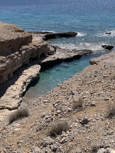 BEWARE! Unfortunately a bit of a waste of time for us. There was no way to get down as there were 90° steep cliffs and thorn bushes surrounding the whole beach. There is only loose big gravel everywhere, trying to climb down would be a certain hospital trip, even for me, a 30 year old experienced climber. Even the path down from the parking spot was dangerous as the gravel/rocks are very loose and slippery. My 60 year old (but very sporty) mother fell here and got away with a few scrapes only. Once we reached the end of the path we looked down at the beach and didn't understand how people here got down there. We scouted the entire area around and saw no paths other than 90° loose gravel cliffs. You probably have to swim from Kalami beach. We had to give up, and headed back to our car, sweaty, warm and disappointed. Area was absolutely beautiful however, so not a complete waste of time...