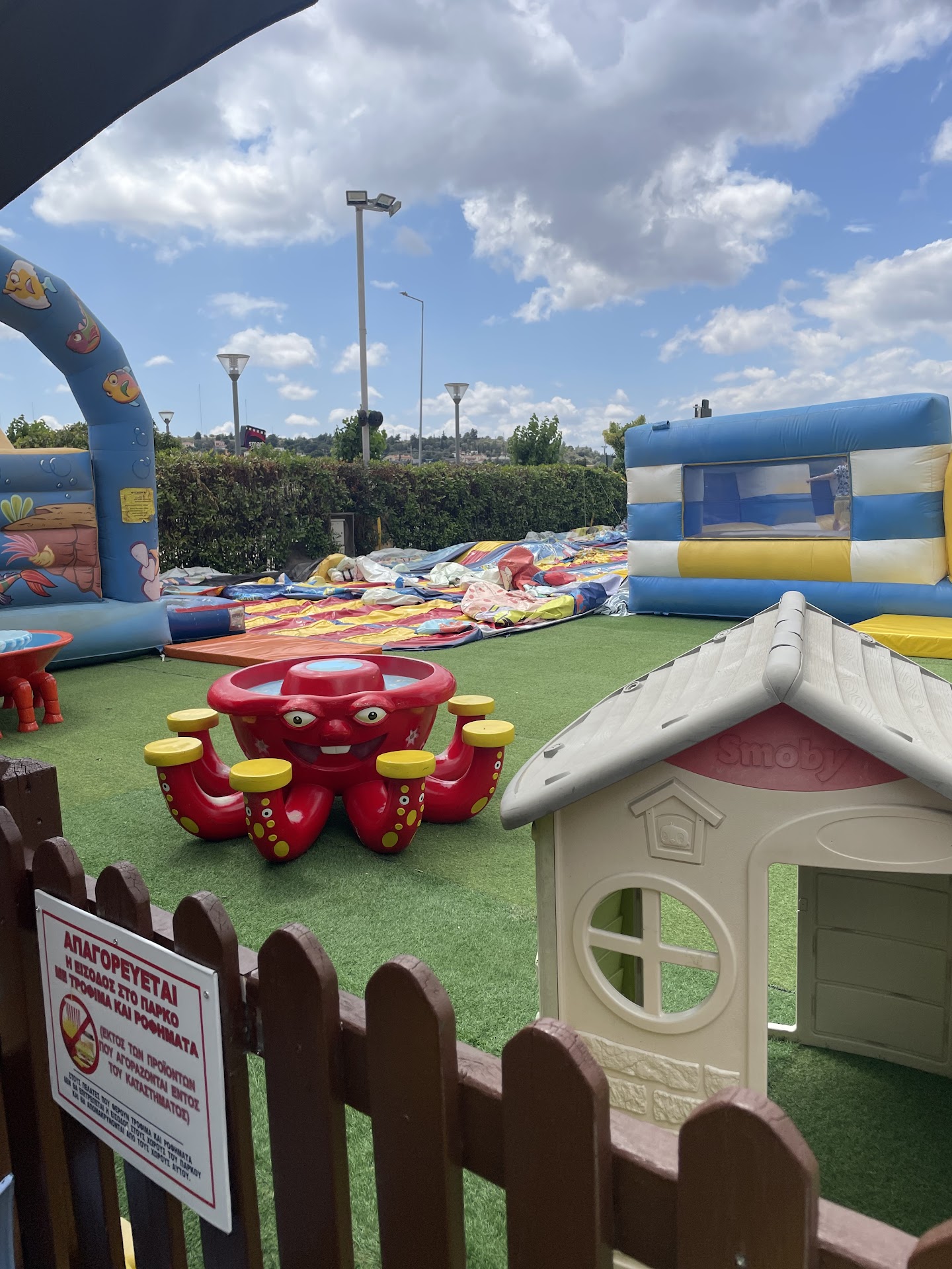 Μεγαλώνεις τα παιδια σου μαθαίνοντας τα να μην εμπιστευονται τους ξένους,και έρχεται η ώρα που φτάνει κάποιος στον συγκεκριμένο παιδοτοπο όπου πρέπει να αλλάξεις την κόσμο θεωρία των παιδιών απο την μια στιγμή στην άλλη...Ας εξηγήσω... Φτάνουμε Σάββατο πρωί με ένα παιδί σχεδόν 4 χρονων και ένα 7 ..πληρώνουμε τα εισητηρια και μπαίνουν στα φουσκωτα,(φουσκωτά που αν με ρωτάτε δεν είναι για όλες τις ηλικίες άσχετα με το τι λέει η ταμπελα)ο μικρος λοιπόν φοβόταν να μπει στα τεράστια για εκείνον φουσκωτά και δεν έμπαινε πουθενά, στην προσπάθεια μου να τον βοηθήσω είπα να μπω να μπουνε σε ένα μαζι ώστε να δει πως δεν είναι τίποτα, εκεί ενημερώνομαι απο την κυρία που ήταν μέσα πως δεν επιτρέπεται να ανέβω για την ασφάλεια του παιδιού . Προσπαθώ λοιπόν να ενθαρρυνω το παιδί έξω απο το φουσκωτά και να τον πείσω πως δεν είναι τίποτα...με τα πολλά ανεβαίνει το παιδί και κολλάει επάνω γτ φοβήθηκε και άρχισε να κλαίει, η κυρία που είναι μέσα επιμένει πως δεν μπορώ να μπω να βοηθήσω το παιδί ΜΟΥ και ανεβαίνει εκείνη, το παιδι συγχισμενο έχει μια άγνωστη δίπλα του που του λέει "είμαι εγω εδώ, μαζι θα κατέβουμε ",κάτι που το παιδί δεν έχει συνηθίσει και κλαίει περισσότερο. Για να μην λέω πολλά το παιδί για να αποφύγει την άγνωστη σε εκείνον ξεκίνησε να κατεβαίνει αναποδα απο την σκάλα για να φτάσει στους γονείς του. Όταν ρώτησα τι παράλογη απαγόρευση είναι αυτή πήρα την εξής απάντηση... "Όταν ανεβαίνετε με το παιδί στην τσουλήθρα μπορεί να το πλακώσει απο πάνω, εμείς είμαστε εκπαιδευμενοι για αυτό ..." Και αναρωτιέμαι ποιος εκπαιδεύει κάποιον πως να κατέβει απο τα φουσκωτά, ποιος επιχειρηματίας είναι αυτός που δεν επιτρέπει σε ένα ΠΑΙΔΟΤΟΠΟ για ανήλικα να μην έχουν τους γονείς τους δίπλα σε κάποια δύσκολη για αυτά στιγμή... Μπορεί η περιοχη να μην έχει πληθώρα παιδοτοπων όμως σίγουρα σε αυτόν δεν πρόκειται να ξανά πάμε και φυσικά δεν θα το προτείνουμε σε κανέναν. Όσο αφορά σε όλα τα υπόλοιπα ΠΑΝΑΚΡΙΒΟ ΧΩΡΙΣ ΣΕΡΒΙΣ ΧΑΜΗΛΗΣ ΠΟΙΟΤΗΤΑΣ ΚΑΦΕΣ ΟΧΙ ΠΟΛΥ ΚΑΘΑΡΟ Ότι πρέπει για μην...