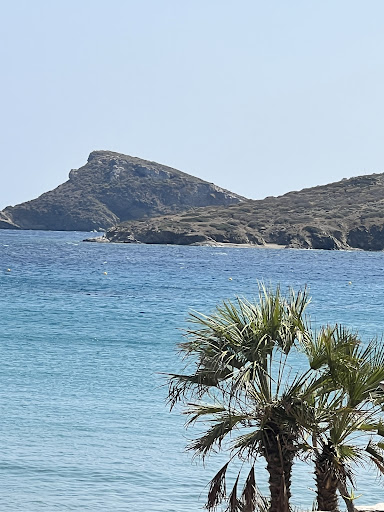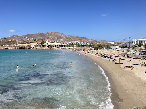 Nice sand beach with crystal water and youthful vibe. Popular for Greeks and fewer tourists. Bar on hill plays cool pumping music as the sexy bikini crowd overpays for drinks and beds. Other restaurants behind the beach. Parking on road and near the bar on hill. Sand is great. Long shallow area. Mainly protected from the wind. Maybe the coolest beach with sexiest vibe. Covered beds were 60 euro, set of 2 was 50 euro…or grab free sand. You can sit in the vibin’ bar for free or pay for a bed from them (waiting list in June which is dead season here) but you have to buy drinks and or food. It has easy entry to water and we chose to sit in the bar. Better my money go to drink and...