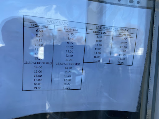 This is the bus stand of Oia. Buses operate between this bus stop and Fira. Im attaching the bus time table here as pasted on the wall. Buses are reliable. There may be delays of 5 min like but bus will come. This bus stop is located close to main walking alley of Oia where main photo stops like 3 blue domes are located. Main walking alliey starts about 500m before bus stop along the coast towars fira. Bus stop is located close to midway of the alley and alley continues further towards Oia castle which is one of the best sunset spots. Other best place for sunset is 3 bells of Fira or on its path. Central bus stand in Santorini is located in Fira, which is the capital of Santorini. Buses run to other areas of the island from Fira. So from one area, you have to first get to Fira and then to the other area. For example, To get to airport from Oia, first get to Fira bus stand and then to airport. You have to pay buses in CASH and should be bought from...