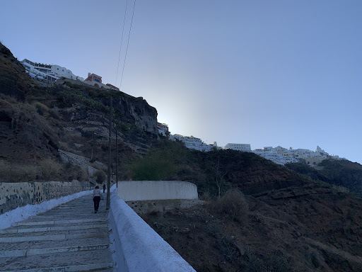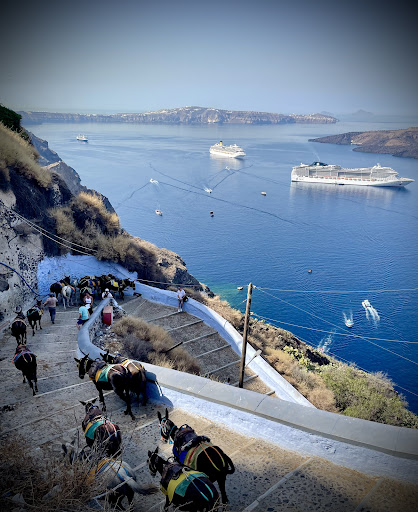 Visited Santorini with Royal Caribbean.We arrived through Athinios port on tender and proceeded to Perilovos Beach .It was Beautiful, and we then went Fira for Lunch and shopping. Upon return to the cable car we discovered it was a two hour wait to get the cable car down. It was 32 c and many people were complaining about the heat and line up so many were headed down the trail on foot to the old port. We went down the trail and were shocked by what we saw.Many people being pushed against the walls by donkeys.Many people falling down on the steps.One older gentleman had to be rescued as he was in distress on the way down. I personally had fallen twice, my wife fell once the lady in front of us fell.I had a donkey running towards me, and trying to dodge it another behind ran the other direction into me.The rider guiding them up was sleeping in the saddle when I yelled at him to wake up and control his donkeys.We all stepped and slipped in donkey manure. This is how government of Santorini treats the tourist who have spent so much money in there town.This after the Restaurant owners, shop owners, cab drivers, wait staff work so hard to bring in business and treat people well. What for , so you can employ some mean sleeping donkey trainers and torment a bunch of donkeys and tourist. I will not spend a dime in Santorini again, even though I loved the visit right up until the walk down this trail. The local government should be liable for every person hurt walking down that trail or having a medical emergency waiting for hours in a line. They have options, Athinios was efficient and safe to get onto the island. Instead hey wish to treat leaving tourist like Donkey manure. I won’t come back unless the local government...