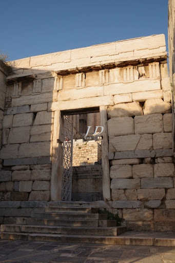 The gate and its flanking rectangular towers are part of a 3rd century AD fortification system. Reused architectonic elements were utilized in the building of the gate. Among those elements are inscribed slabs from the dismantled Choregic Monument of Nikias that since 319 BC graced the southern slope of the Acropolis. You can see easily see one of these Greek inscribed slabs above the exterior (West)...