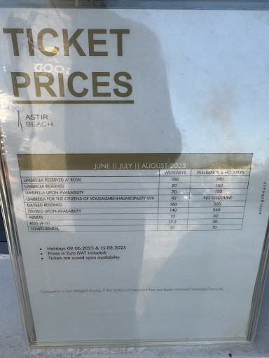 Read more60 EUROS just to swim. At 7PM. Crazy! You have to access it via Astir, and the customer service was not good. I couldn’t understand the price, so I made the woman repeat herself and she let her annoyance be known. SIX- ZERO! What a joke! It’s actually disgraceful for Greece to allow privatization of beaches in the first place,...