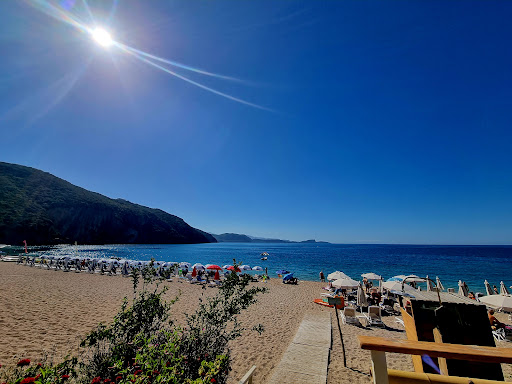 The beach looks extremely beautiful, one part of the beach has extremely large stones at the entrance to the water, the part above with smaller stones on which it is possible to stay but only if you have your own umbrella and sunbeds, the other side, the farthest part of the beach is with fine sand covered with an olive grove, there is camp, also, if you have your things you can stay on the beach as much as you like. it's much nicer if you go to that part of the beach with children. The central part of the beach is obscenely expensive, with sunbeds that charge 50 euros, and access to that part of the beach from the road above the place is impossible, because security will stop you and not let you pass ( they say that is private beach - insane). We have never experienced anything like that in Greece, and we have visited a large part of the country. The other part of umbrellas and sunbeds is charged at a reasonable price. There are no showers, there are no trash cans, the beach is very beautiful, there is a lifeguard, but passing from one end of the beach to the other part of the beach is impossible through the street, except through the water, there is no promenade, so the rating is like this because of...