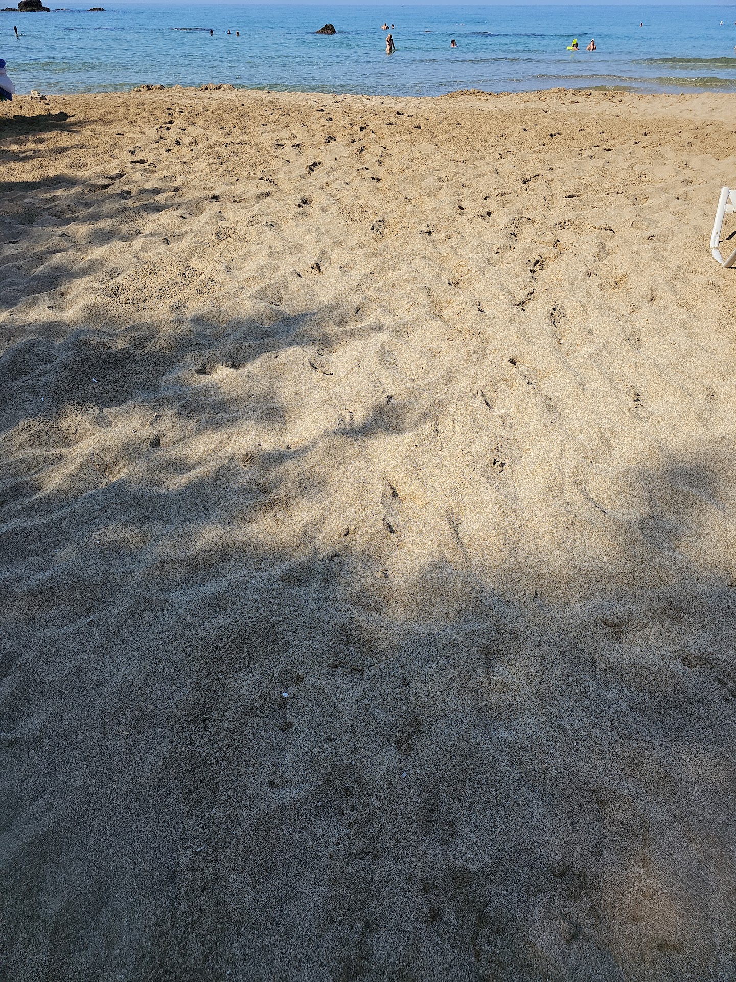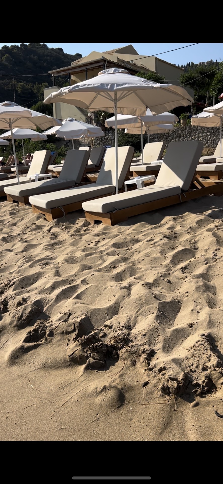 We parked at a brand-new Beach Bar (free if you pay for sunbeds), which looked stunning. I can’t remember the name as it was opening the next day. However it was next to Spyros Bar I think. Anyway at this brand new beach bar the sunbeds were clean, soft, and luxurious, costing £20 for a set with an umbrella. It's worth the extra £5 compared to other places that charge £15 for simpler, less comfortable options.