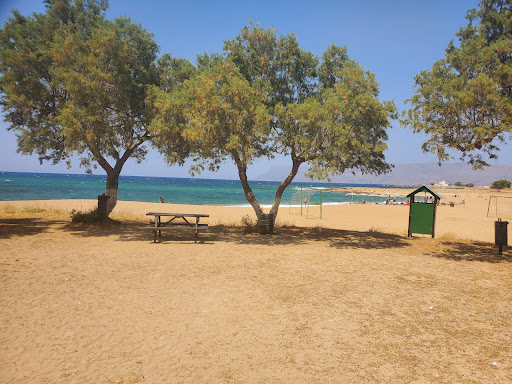 Read moreIt's one of the best beaches in the area for those who likes serenity. It has a stone plates at the beginning, but from the right side corner you can enter the sea easily just on sand and after couple of meters enjoy the deepth. The sand is made from very tiny 🐚 shells parts and it is yellowish. There is no somany sunbeds. One umbrella and two sunbeds cost 4 euro only. There are also two changing clothes boots with showers. There's also a small playground for children and small football pitch. Also popular among locals. On weekend there is more people, but never crowded. Great place...
