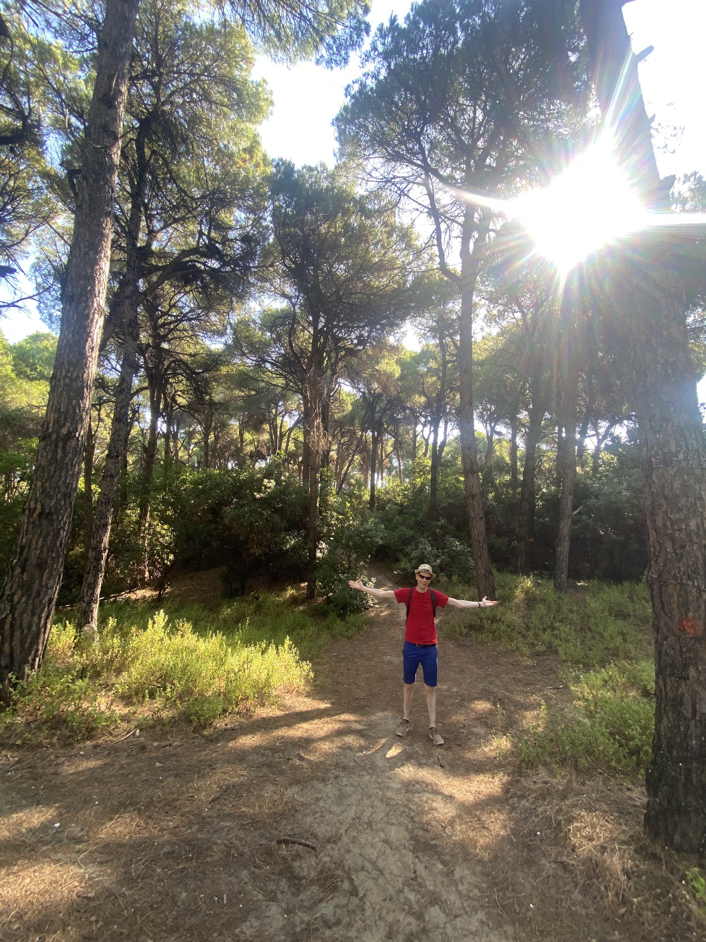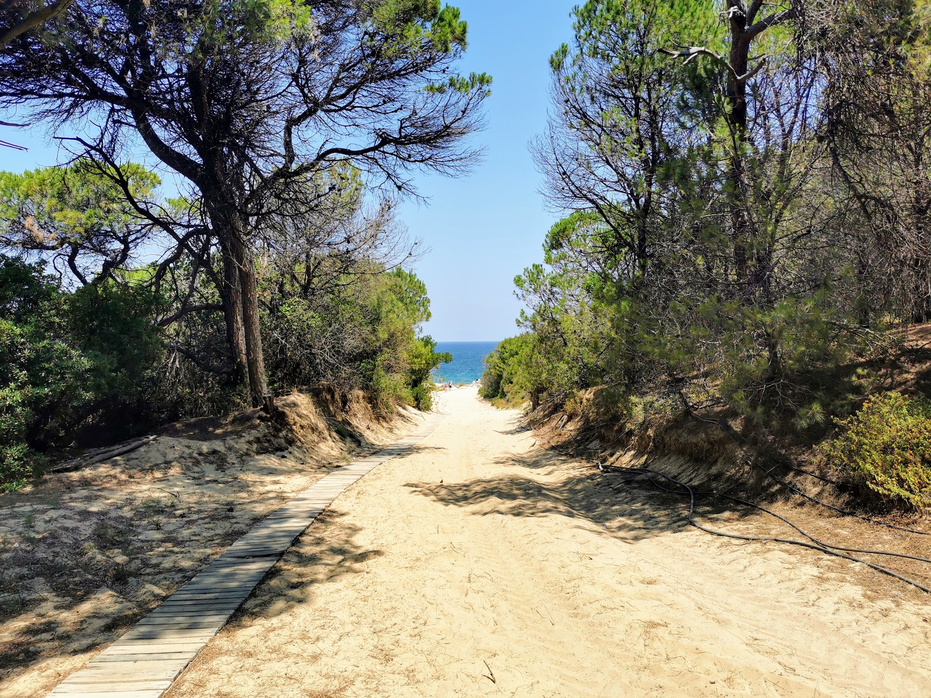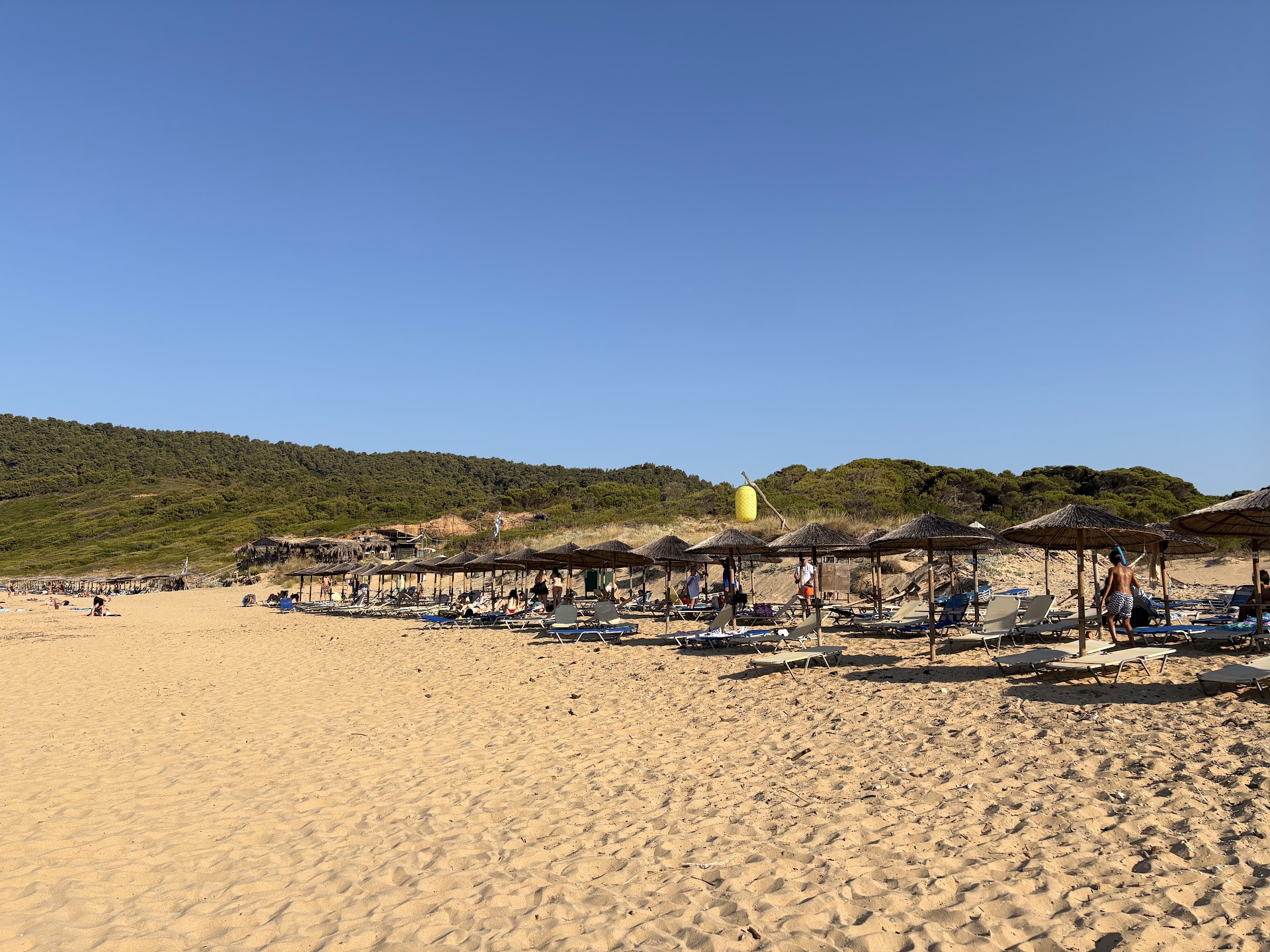 Perfect beach - quiet (no party music), great facilities (multiple changing huts, shower, well-stocked cafe, toilets, wifi) and away from the crowds. We were there all day and the people got to two rows deep. You can pick a quiet spot and just relax. A set of sunbeds costs €15, half the price of the koukounaries beach. Lunch for two (two cooked meals with two drinks) was another €30. Very reasonable. The sea is warm and shallow for 40-50 metres from the shore. You can swim for ages and still stand up-right. Perfect for people who aren’t natural swimmers but enjoy a paddle. We walked through the forest to get here, signage is good for about 75% of the way and then disappears for the last 5minutes. My advice, don’t follow google, stick to the MAIN paths and to the general direction that you want to go in. You’ll see the blue skies through the forest and hear the waves before you see the beach. Bring comfortable walking shoes and flip flops...