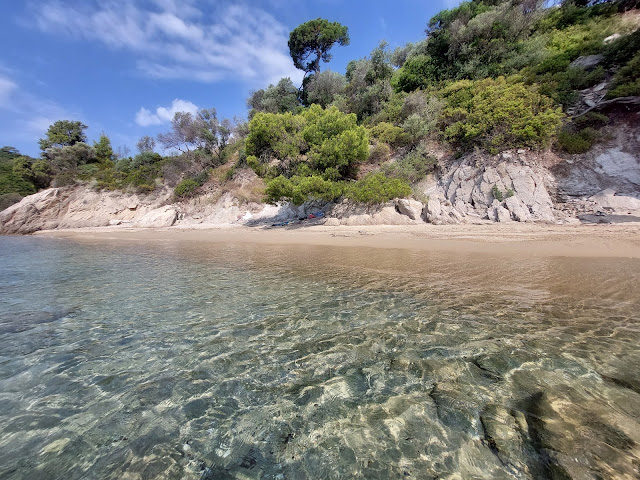 Read moreBella, sì, ma... vale la pena? Ci si accede scendendo un sentiero impervio non segnalato (affidarsi al navigatore per intercettarlo) che inizia sul punto sommitale di una collina che scende poi verso Maratha beach e, successivamente, Koukounaries; in alcuni punti non scivolare è impossibile (la corda per aiutarsi citata da alcuni io non l'ho trovata...), poi si arriva a questa spiaggetta che è davvero minimale sia in larghezza che in profondità (oltretutto il sole ci arriva più tardi che a Koukounaries). Un consiglio per avere altrettanto e di più senza rompersi l'osso del collo? Portarsi più avanti a Koukounaries, superare il moletto sulla estrema destra della baia (guardando il mare), oltrepassare agevolmente una barriera di scogli per immettersi subito in una spiaggetta paradisiaca (che chiamerò "innominata", con tanto di pinetti ombrosi, questa spiaggetta separa Koukounaries da Xenia beach, parimenti raggiungibile dalla spiaggetta selvaggia di cui parlo superando facilmente altri scogli). Qui vi sentirete come Robinson Crusoe, mare splendido al riparo dai venti. Allego foto di questa spiaggetta...