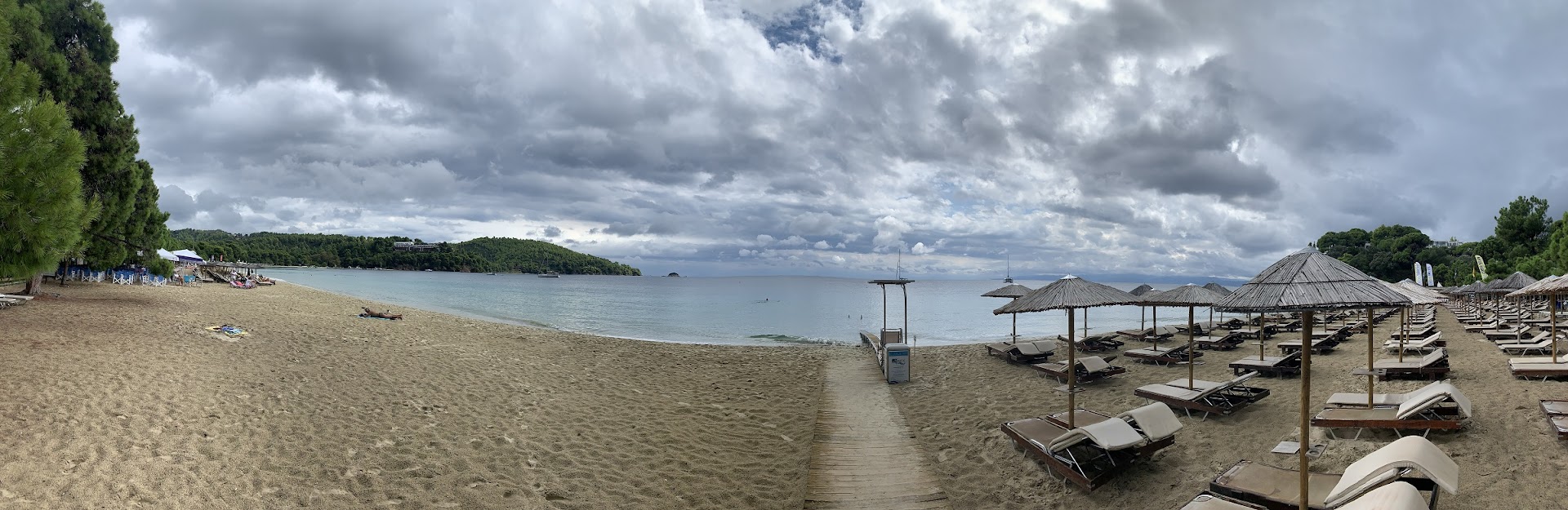 Long sandy beach, lots of natural shade under the pines. At the entire length of the beach the protected area stretches behind it, offering walks through the pines, really nice when the sun is too strong. Beach has toilets (no charge), and showers. Showers have a bit poor water pressure though. Bus from the city to the beach is 2€ and goes every 15 min or so. Almost all sunbeds have 'sponge-filled-cover', makes it really nice to lye down on (10€ for two sunbeds, 8 if you're using natural shade). The distance between beds on the beach is too narrow imho. Entering the water, you'll see a very gradual entrance depth, ideal for kids. There's no waves whatsoever. If you're up for driving, at the edge of the beach is driving club. Also, if you like watersports there's 3 clubs all over the place. There are three bars: starting from the one one closest to the Palace hotel, ending with the one closest to the bus station: first one is the worst - the staff is ok and friendly but the owner will try to "forget" to return the change every chance he gets, and the food portions are smallest and also the priciest. The next one has very good food, is cheaper than the first one (e.g. 5€ instead of 6€ for orange juice etc), but the downside is that there's a "DJ" that at times plays music so loud you can't hear your thoughts. The third one seemed ok, but it was the furthest so we...
