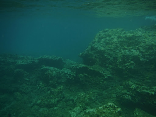 The beach it is not very spectacular, but is it crowdy due to the existence of the nearby hotel. The sand strip has about 150 m long and 20-25 m wide, with a three sunbeds rows in the central and left side. We found without problem a parking place and also we get sunbeds (but on that they there were mostly “smokebeds”. We tried to ignore the very large and dense smoke clouds that were covering the entire area and blocking the sun, creating an unreal yellow light, including underwater (see the pictures). Because we tried to ignore the vegetation fire danger (we were just at the beginning of our twelve days’ vacation in Thassos) we started our snorkeling exploration of the left side of the beach were there is an underwater rocky extension of the land, separating the Rosogramos beach from the Notos beach. Anyhow, the underwater landscape is not so monotonous like the beach itself. My score appreciation for this snorkeling side...