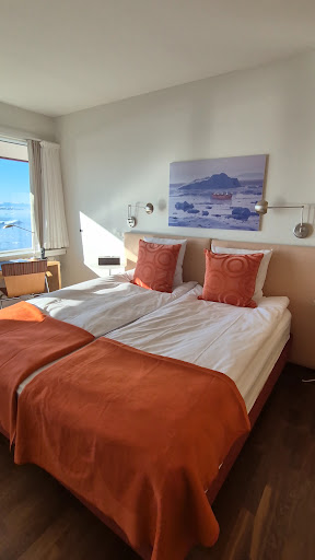 I stayed at this hotel as part of a photographic group of 16 people in Ilulissat, Greenland. |Upon arrival and check-in--(which I understood was 3 pm and I was early) I was greeted by a relatively unfriendly individual,( I believe his name was Axel), who rudely told me it was impossible to check in any earlier than our allotted time. I was okay with that but not with his lack of hospitality skills. I had the unfortunate displeasure of dealing with him on a few more occasions during my 5-day stay and at no time did his skills show any signs of improvement with me or any other guest I witnessed him speaking "down to." ||I was provided a standard room (200 wing) which had a nice view of the water, icebergs, and boats. The room had two single beds moved together to provide a queen. There was a desk and chair. The room was small but adequate for one person, and probably a bit tight for two. The bathroom was also small but again adequate and clean. Very limited soap, body gel, and shampoo. If you do stay here I would suggest bringing your supplies if you have personal preferences for the items you use. The towels were okay but not soft and thick. One window in the room was able to be opened. Dark-out curtains were provided for our 24 hours of daylight. ||Breakfast offerings included soft/hard-boiled eggs, scrambled eggs, fruit, cereal, yogurt, fresh juices, freshly baked sweets and bread, and good Greenlandic coffee. Items were regularly refreshed.|| Lunch and Dinners at the hotel were very good with an assortment of items to choose from. One night there was a wonderful buffet that included native specialties: muskox, reindeer, whale, seal, halibut--fresh and smoked, king crab legs, Greenlandic shrimp, assorted salads, fresh cooked whole grain breads, fresh baked desserts. the meal was truly a beautiful and delicious buffet of native foods.||There are a few employees of this hotel who really stood out and bent over backward to assist in making this hotel a pleasure to stay in.|I needed to spend one more evening here before my departure. ( I did have a reservation at another hotel but staying would save me from packing and unpacking to move). Axel repeatedly told me that obtaining a room for the night was impossible as they were fully sold out--- however, I knew there were flight cancellations due to the weather and therefore would have room availability. After being told one more time, "not possible" I went to the desk later to recheck. There was a gentleman named Kasper who managed to find a room not only for myself but others who were traveling with me. He was a king among kings. Not only did he exemplify true hospitality skills, but he was also a gentleman. He was patient and polite with everyone. He found each of our rooms by simply taking the time to look for them, something Axel didn't bother to do. Kasper was a lifesaver and should be acknowledged for his wonderful skills and personality.|4 other employees deserve kudos as well: Jacob, Abigael, and Natalie from the dining room staff, and Clara at the front desk. I'm certain there are others, but I did not get their names. The cleaning staff for my part of the hall were also very nice and accommodating.||Overall, this was a very nice hotel and I would not hesitate to stay here. However, next time I would request an upgrade to one of their glass rooms. These were designed for Borealis viewing, however still beautiful even if not at the correct time of the year. Book well in advance as these rooms are...