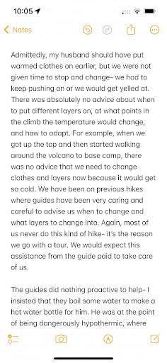 The guides were so focused on pushing us along that my husband ended up with hypothermia. We could see there was rain coming over and we asked the guide if we should put wet weather gear on. He said ‘no, later’. The rain then came on very quickly and heavily, meaning we all got soaked as we were getting our wet weather gear out. When we got to the top, it was absolutely freezing, making the wet clothes way too cold and resulting in...